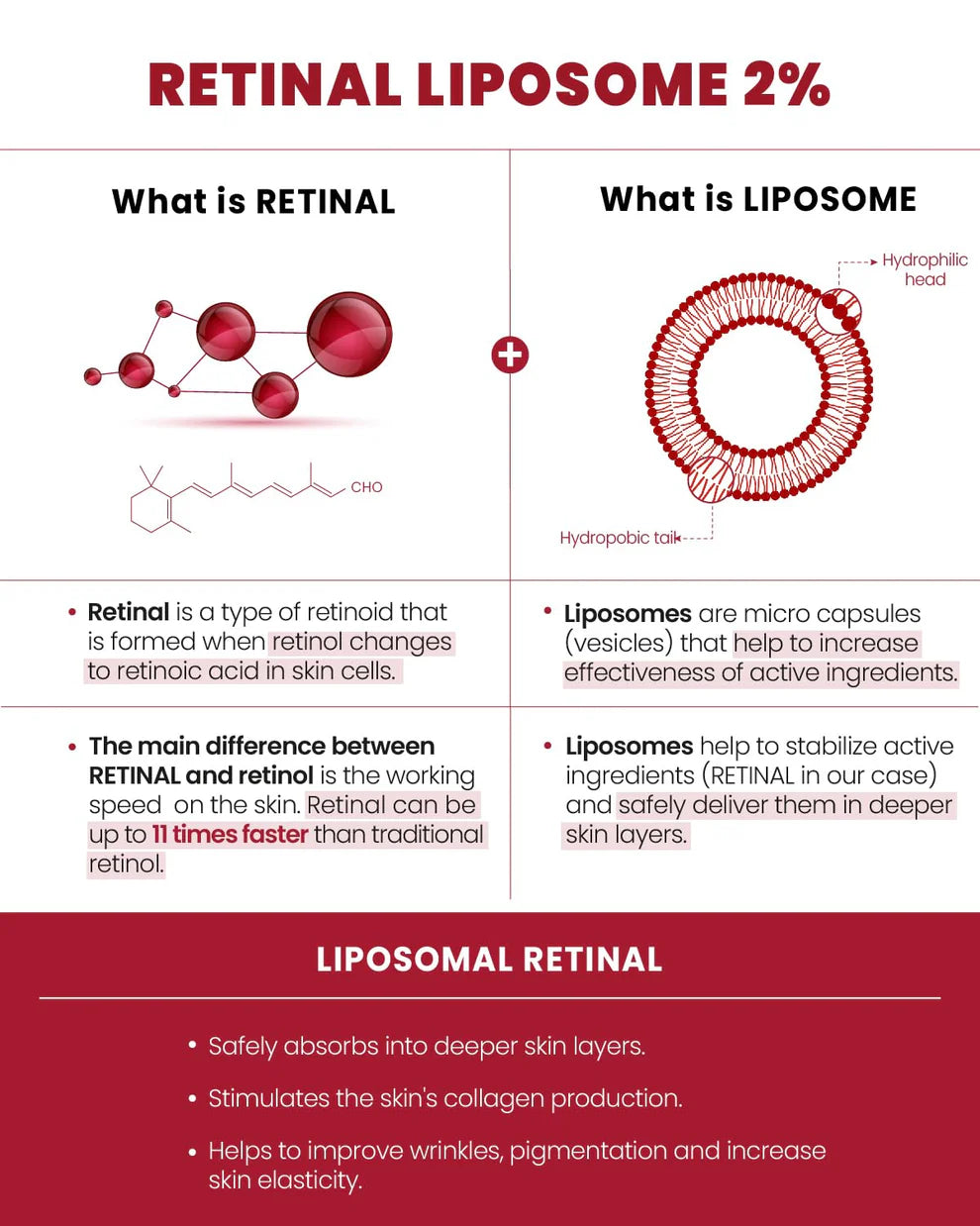 - Retinal Liposome 2%: A powerful anti-aging ingredient that helps prevent fine lines, wrinkles and uneven skin tone and texture. It also reduces oil production, helping to minimise acne breakouts.